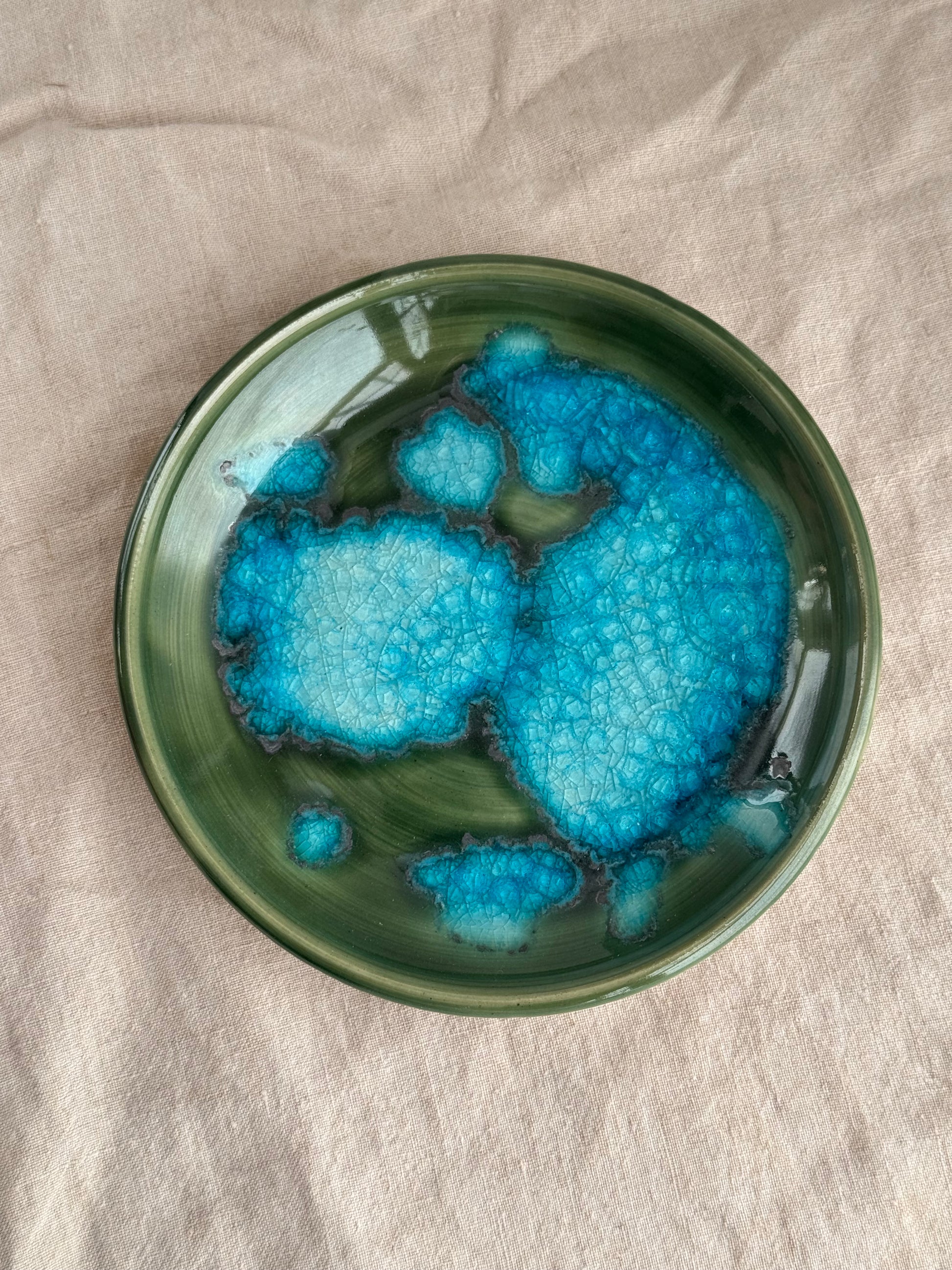 Hand thrown jewelry dish. The dish is glazed in white and recycled glass was added in the glaze firing, resulting in sparkling aqua glass pools. A beautiful addition to someone’s dresser as a jewelry dish or desk to hold odds and ends.