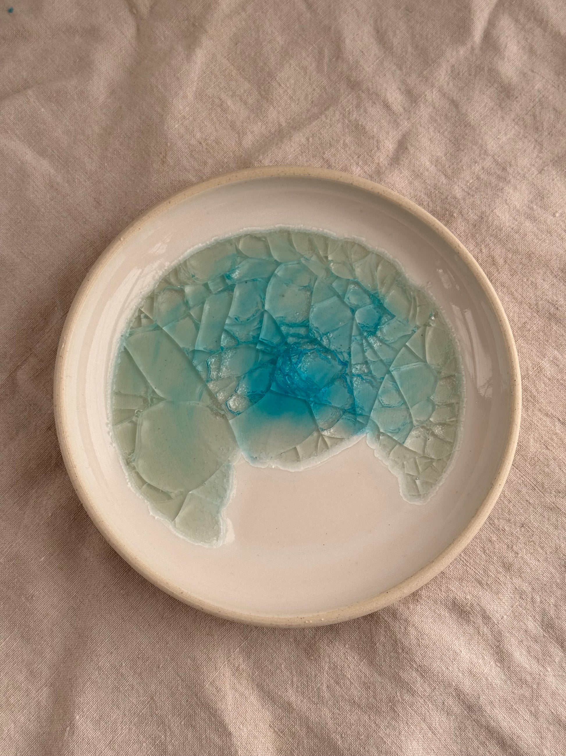 Hand thrown jewelry dish. The dish is glazed in white and recycled glass was added in the glaze firing, resulting in sparkling aqua glass pools. A beautiful addition to someone’s dresser as a jewelry dish or desk to hold odds and ends.