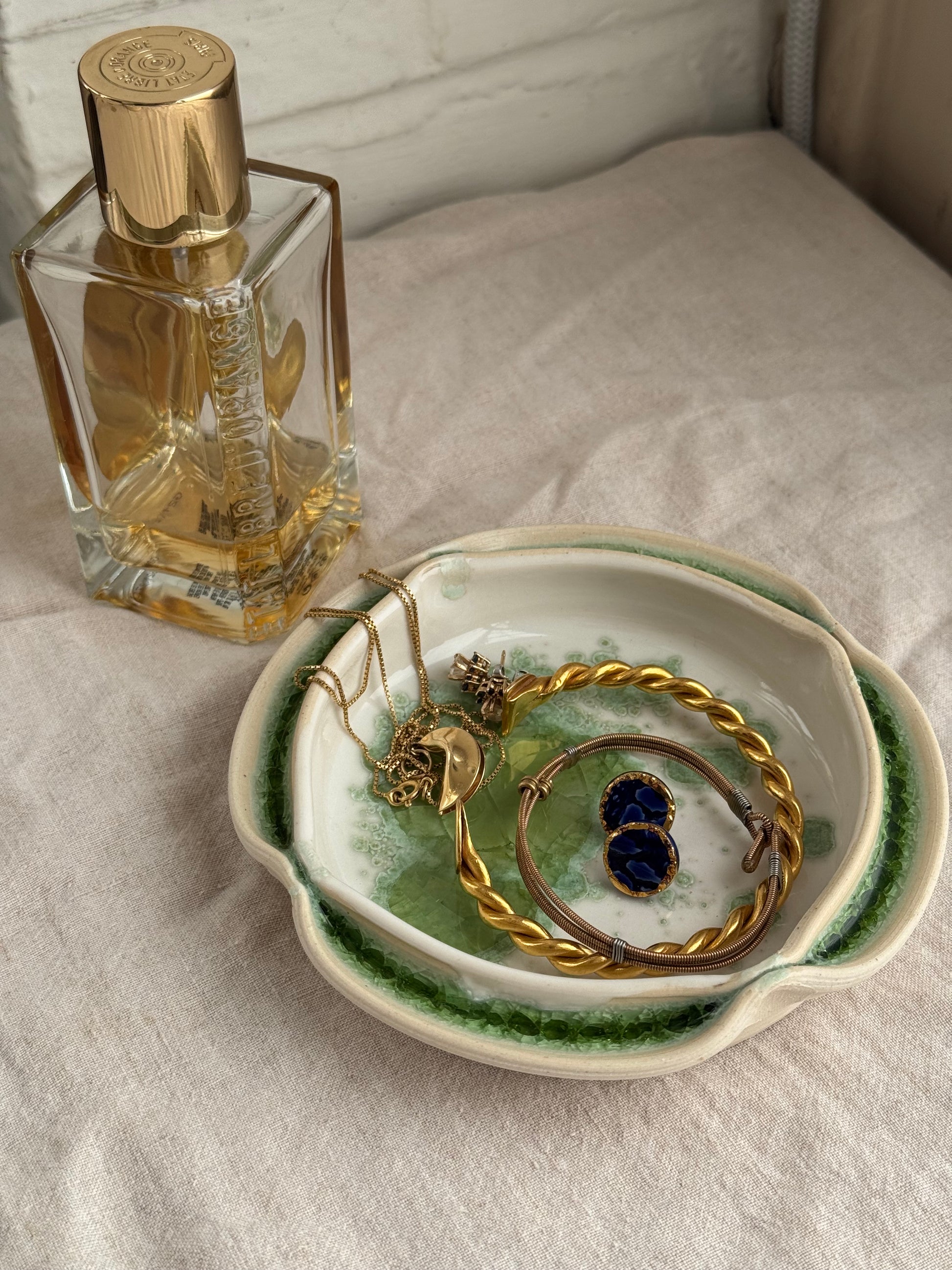 Hand thrown jewelry dish with a scalloped edge. The dish is glazed in white and green recycled glass was added in the glaze firing, resulting in mossy green patches and sparkling green glass pools. A beautiful addition to someone’s dresser as a jewelry dish or desk to hold odds and ends.