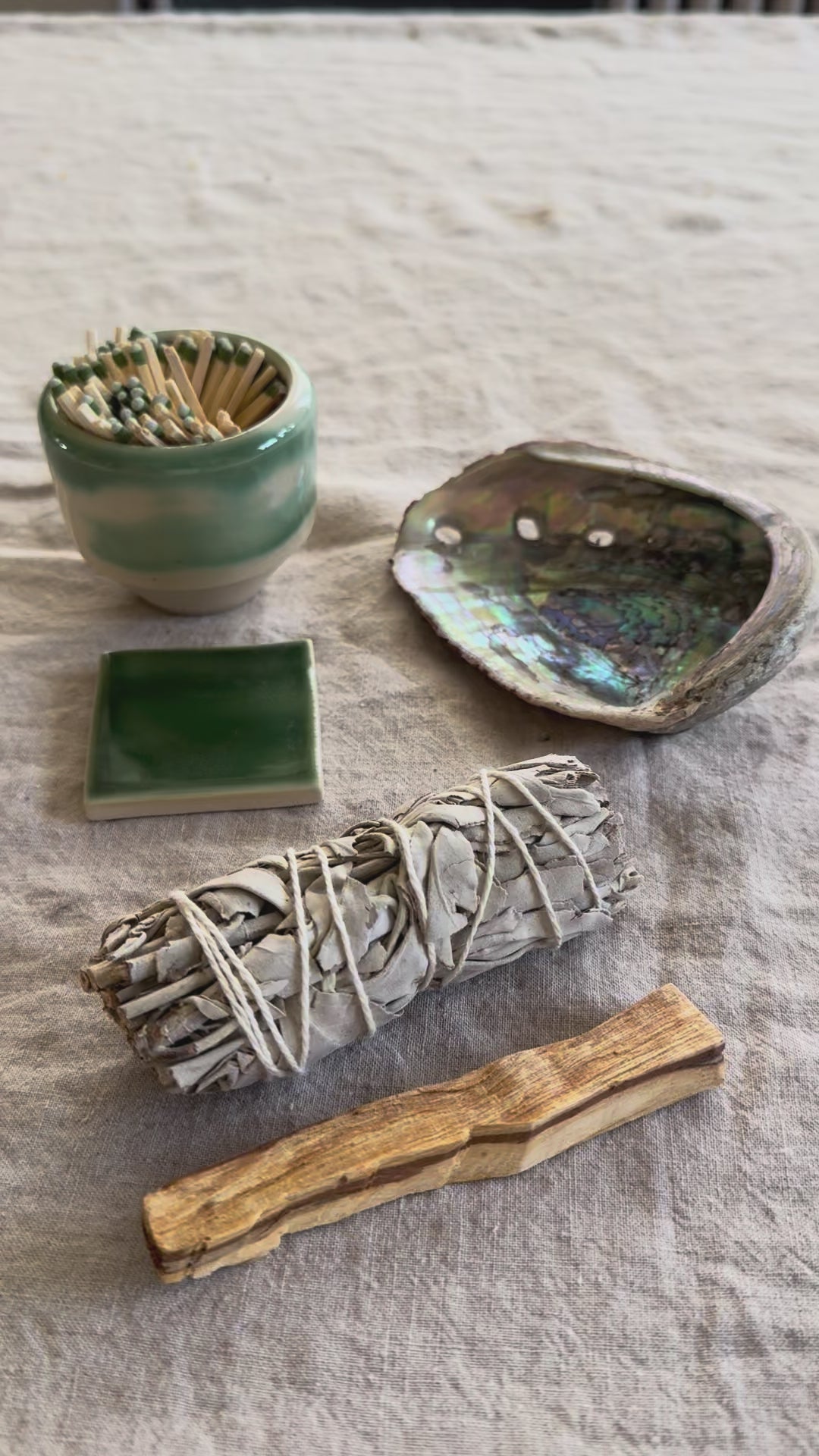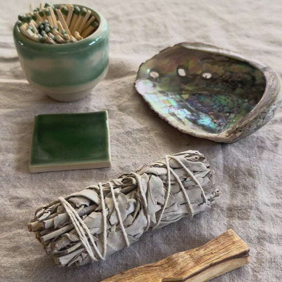 A lovely gift set for your fire and incense loving family and friends! This set includes a hand thrown match holder, handmade tile, strike anywhere matches, a white sage bundle, a stick of palo santo, and an abalone shell. The hand thrown match holder for strike anywhere matches has an unglazed bottom which the matches can be struck on for lighting. The little green handmade tile is perfect for burning cone incense or resting you spent matches while they cool. I know good strike anywhere matches can be hard to find so you can purchase an extra box with the set if you would like!